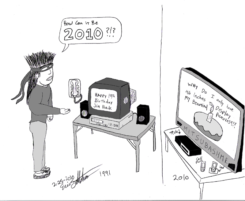 I was a day late updating the birthday cartoon (most of which have not been posted yet, I have to dig through the archives to find them all) because my mechanical pencil ran out of lead yesterday. It's hard for me to believe that 19 years have already gone by and we are already in the year 2010!! As I'm sure everyone is aware, there have been a TON of technology changes since 1991... but in a sense, even though they change form, some things always seem to stay the same..